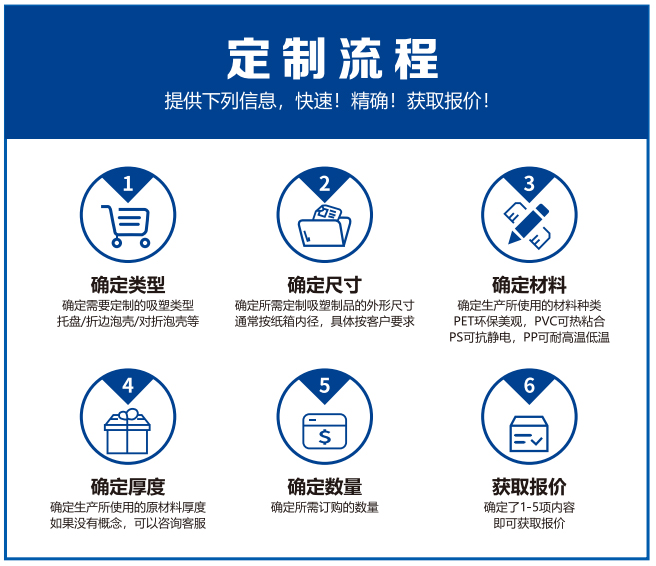 1.确定类型 2.确定尺寸 3.确定材料 4.确定厚度 5.确定数量 6.获取报价